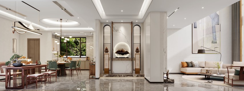 特點(diǎn):1.講究統(tǒng)一、簡潔的色彩,2.結(jié)合墻面的留白、家具的陳設(shè)形成虛實(shí)變化,注重中國風(fēng)元素的點(diǎn)綴和意境的營造;3.選擇富有質(zhì)感的現(xiàn)代材料,家具選擇貴精不貴多。4.不拘泥于中式家具的傳統(tǒng)形態(tài),通過混搭來體現(xiàn)中式傳統(tǒng)的精氣神,重要的是設(shè)計(jì)師對中華文化的理解和創(chuàng)造力,比如利用燈光、色彩營造古典雅致的氛圍,表達(dá)內(nèi)斂含蓄之美,新中式不需要如同皇宮般璀璨紛繁,但一定有體現(xiàn)空間意境的留白之美。