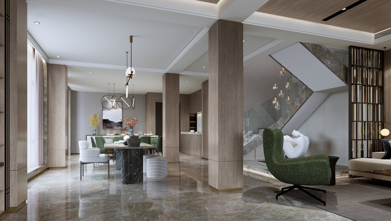 此外,自然元素的融入也可以通過(guò)景觀設(shè)計(jì)來(lái)實(shí)現(xiàn)。別墅室內(nèi)與室外的連接是非常重要的,通過(guò)合理的景觀設(shè)計(jì),將室內(nèi)與室外的環(huán)境融為一體,使居住者可以隨時(shí)欣賞到自然的美景。例如,在別墅的室內(nèi)空間設(shè)置大型的落地窗或開(kāi)放式的露臺(tái),使居住者可以欣賞到花園、山脈或湖泊的美景,進(jìn)一步增強(qiáng)自然的感覺(jué)。