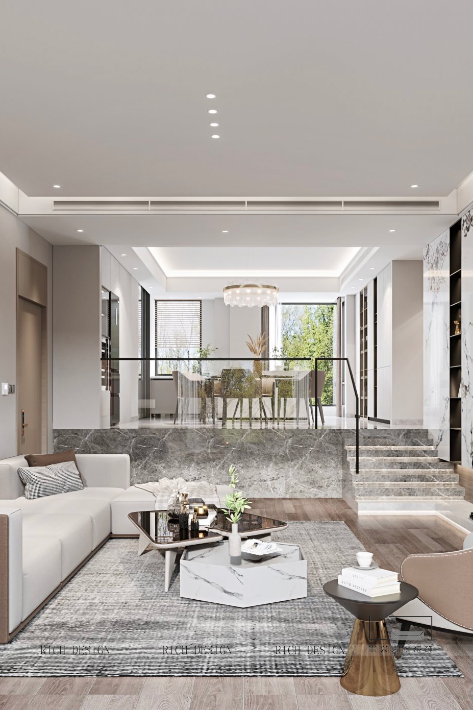 開放式布局是形式和精神的交匯融合,通過(guò)大理石和暖棕的色彩構(gòu)成來(lái)渲染氛圍,描摹了高級(jí)階層向往的休閑生活場(chǎng)景。
