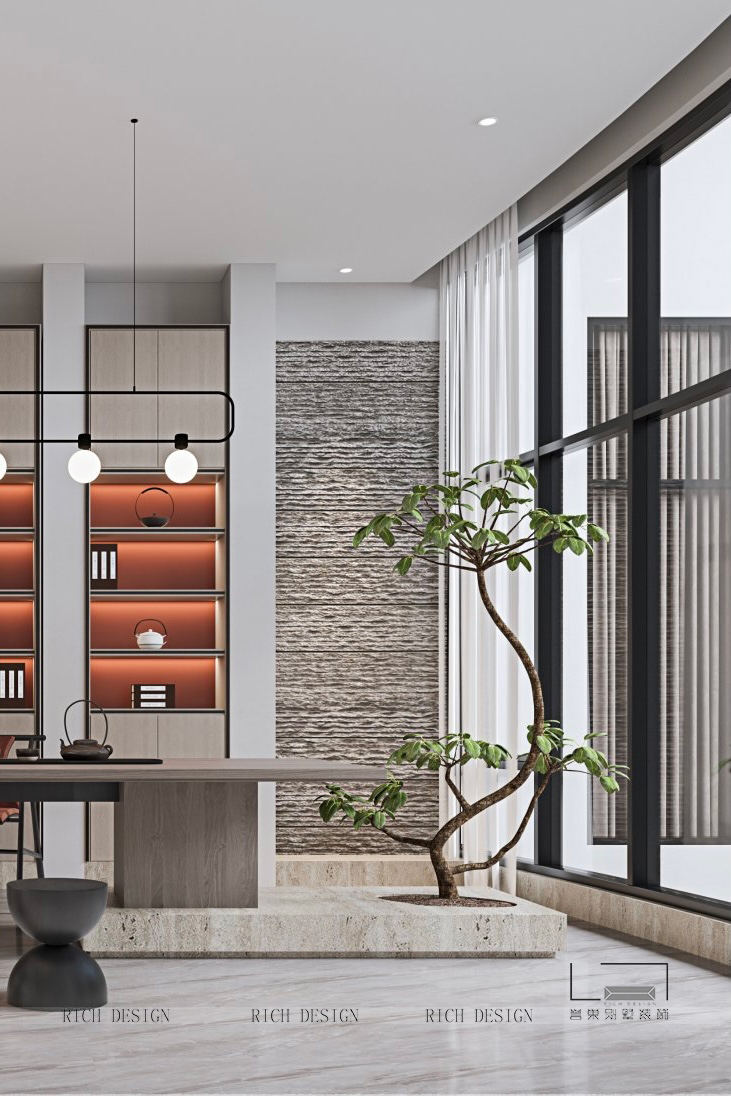 書房目之所及,窗外視野一覽無(wú)余,繁華如畫。室內(nèi)通過(guò)自然紋理木飾面、綠植等材質(zhì)元素的運(yùn)用,以簡(jiǎn)練的設(shè)計(jì)語(yǔ)言,渲染出質(zhì)樸寧?kù)o的生活品質(zhì)。