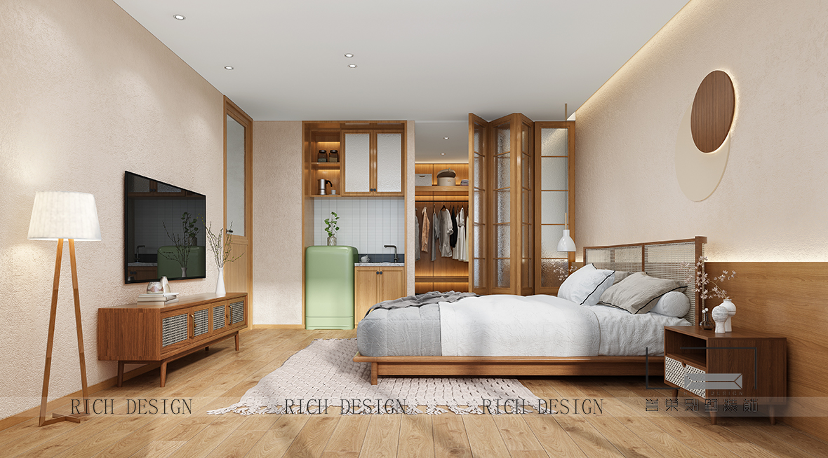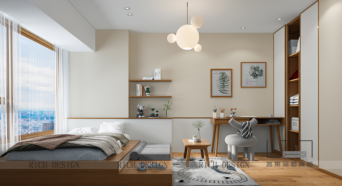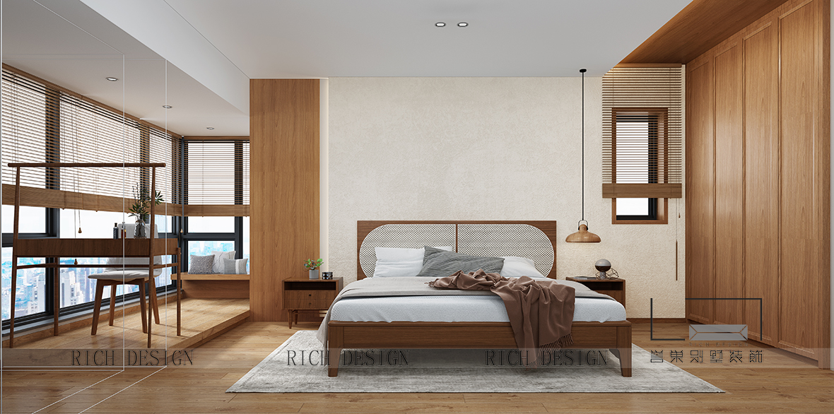 主臥整體色系以原木色為底色,家居用品類選用同色系的顏色,打造出來的原木風(fēng)才自然,借用外在自然景色,為室內(nèi)帶來無限生機(jī),選用材料上也特別注重自然質(zhì)感。