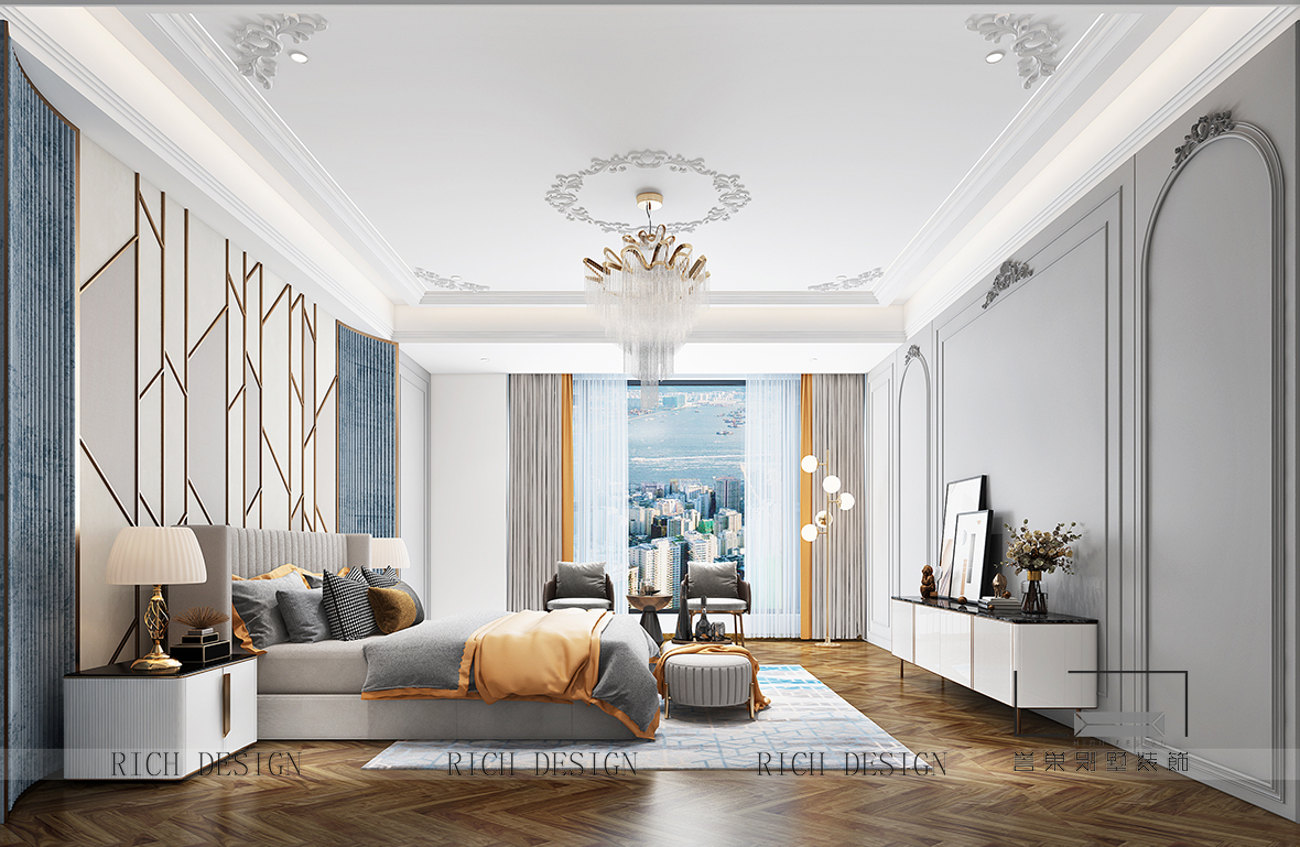 在臥室的總體設(shè)計(jì)上,設(shè)計(jì)師摒棄傳統(tǒng)法式的繁復(fù)、冗雜的裝飾造型與甜膩的色澤,轉(zhuǎn)而用經(jīng)典軸線、對(duì)稱布局的方式,結(jié)合淡雅的空間色調(diào)或幾何線條與典雅時(shí)尚的陳設(shè)軟裝,打造出一個(gè)法式輕奢主義的居住格調(diào)。