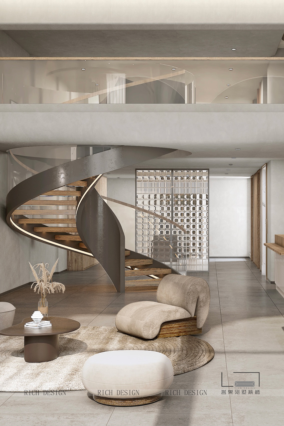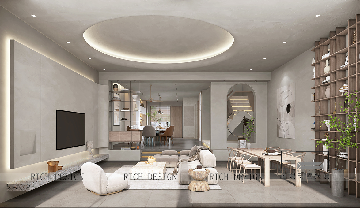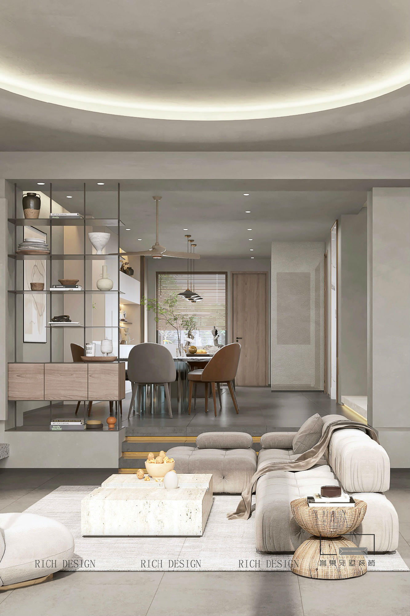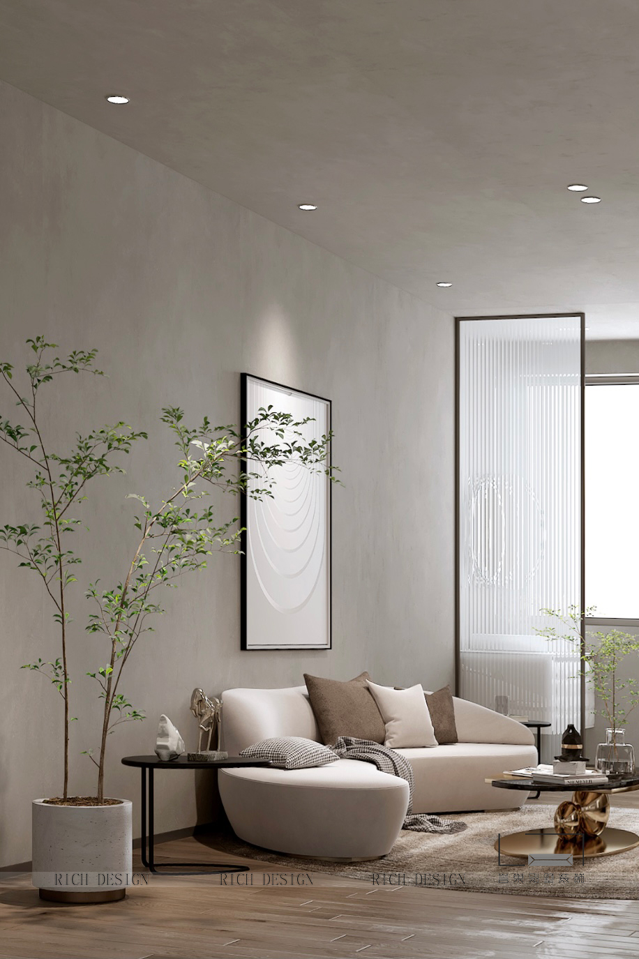 室內(nèi)設(shè)計(jì)主要采用簡約肌理的水泥色木飾面作為主色,借助色彩強(qiáng)化人對(duì)空間框架和秩序的知覺,再加入木作、不規(guī)則家私,透過紋路、肌理散發(fā)出自然樸拙的侘靜質(zhì)感。