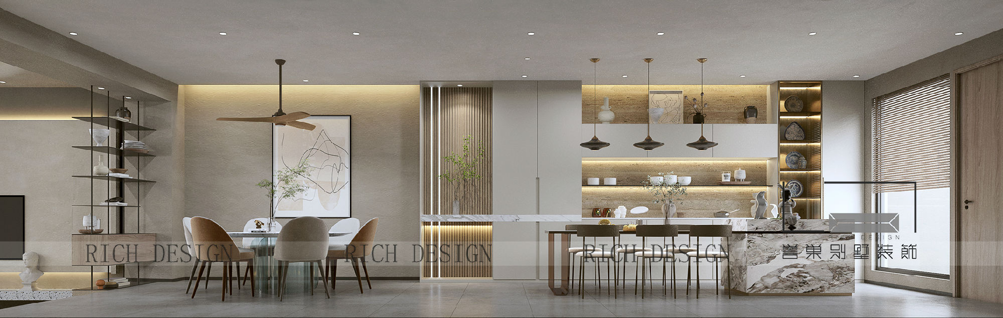在空間利用平滑流暢的幾何線條、克制減法的空間裝飾、疏密有致的明暗對(duì)話,釋放“侘寂”的魅力。