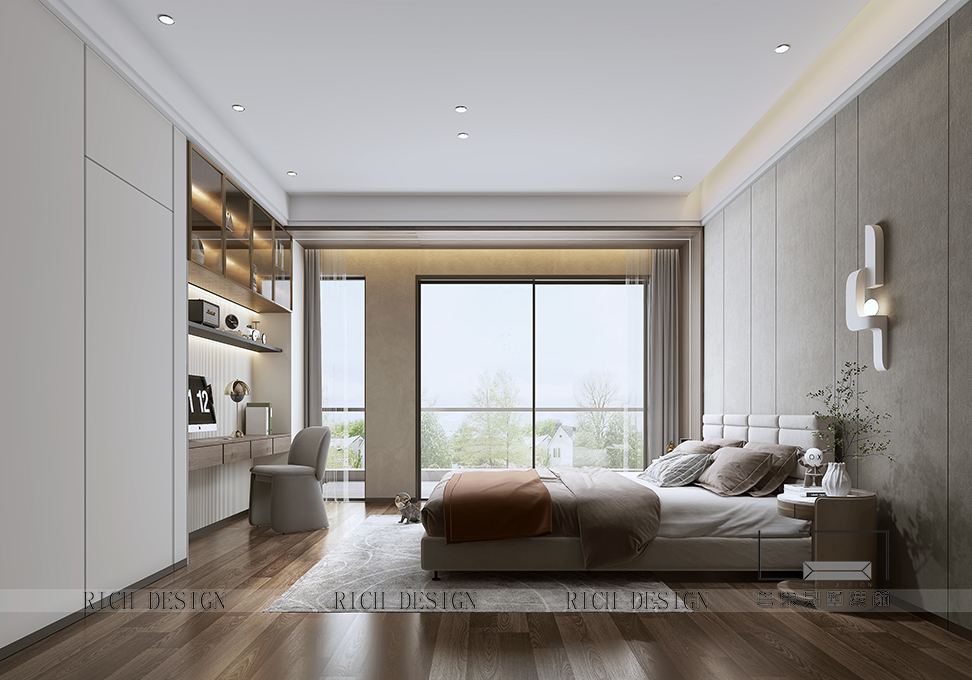 設(shè)計(jì)師基于侘寂風(fēng)簡約質(zhì)樸的設(shè)計(jì)原則,臥室的燈光多為暖調(diào)的光線,在低色溫的燈光渲染下,室內(nèi)氛圍呈現(xiàn)安靜的朦朧感。