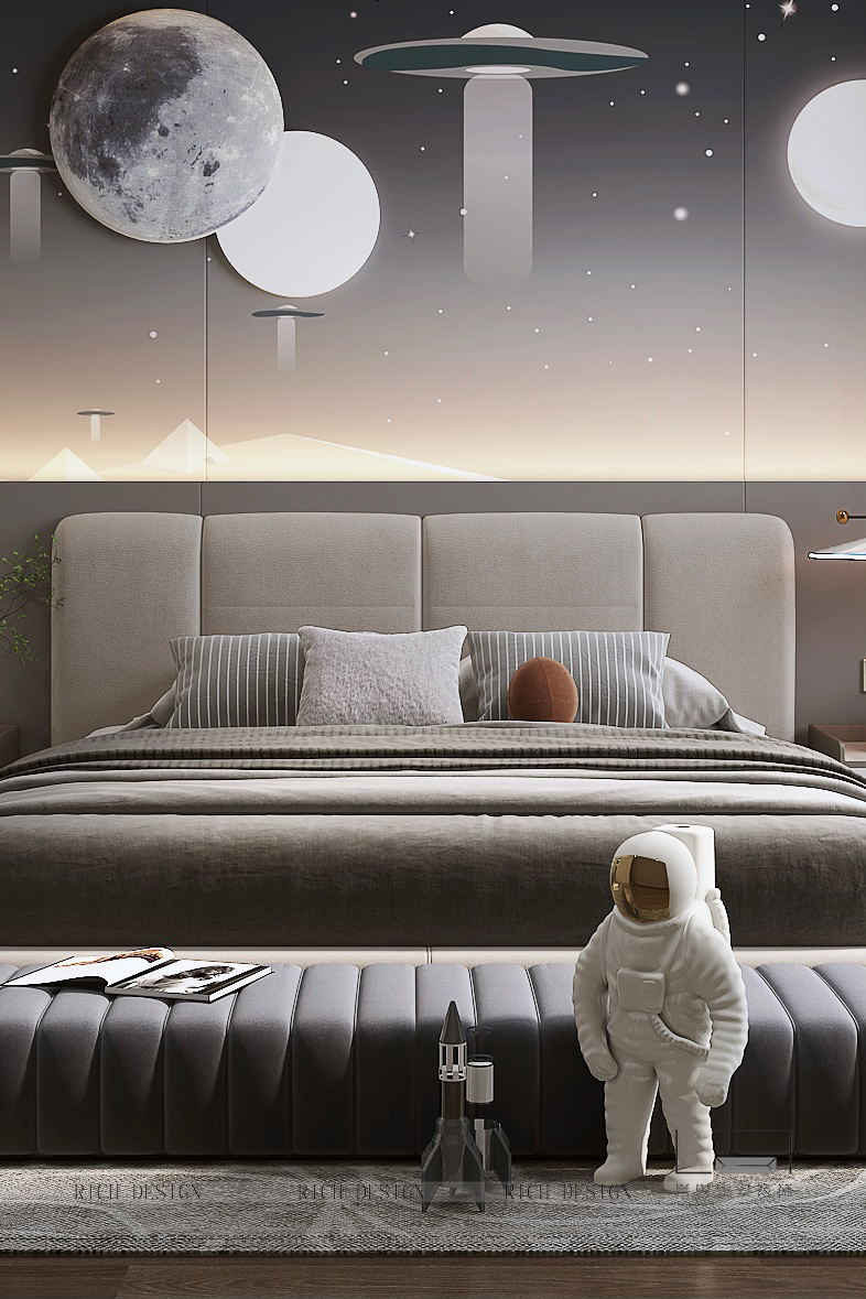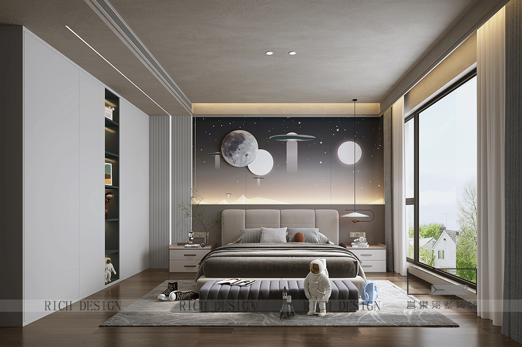 兒童房的設(shè)計(jì)保持空間純凈的本真,不假雕飾,明窗開闊,收納自然變幻的光影,星空航空火箭成為空間最生動(dòng)活潑的裝飾。
