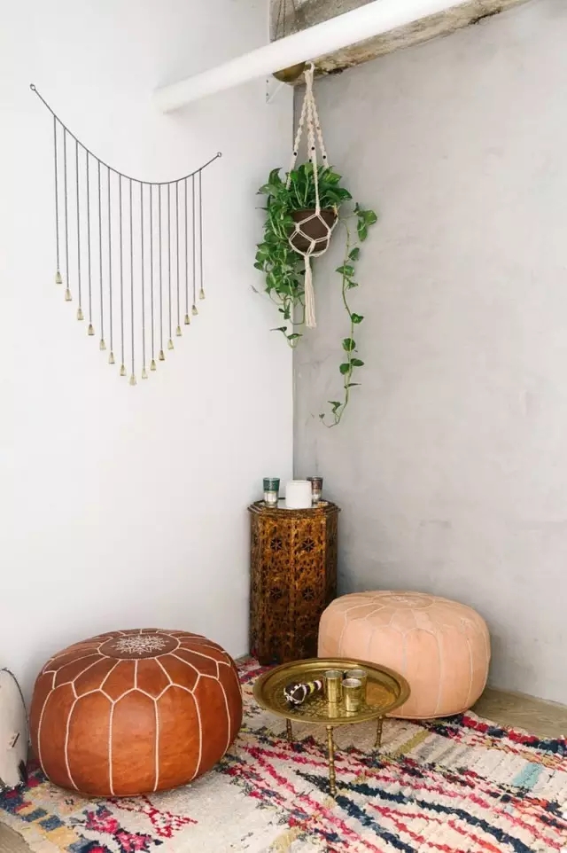用溫潤(rùn)的木質(zhì)地板鋪設(shè),并用充滿民族風(fēng)的地毯進(jìn)行裝飾,角落處精致雕刻的置物桌是屋主在旅途中帶回,黃銅元素的華麗小圓桌,造型簡(jiǎn)潔時(shí)尚的圓凳,在粗獷原始的空間下,多元素多風(fēng)格的家飾顯得更加精彩。