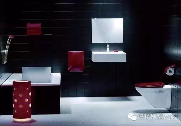在上面這幅創(chuàng)意衛(wèi)浴設(shè)計圖中,設(shè)計師選擇了極具時尚感的黑色和紅色來進行衛(wèi)浴裝飾色彩的搭配。一般來說衛(wèi)浴的顏色我們都會選擇簡潔明亮的白色,再輔以米色、黃色等作為搭配。