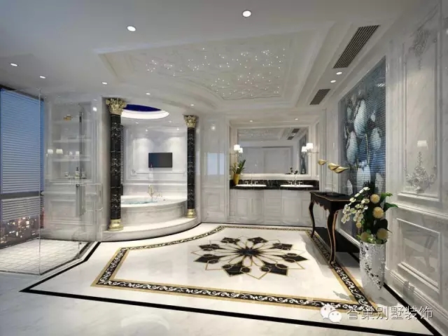 浴室用淺白色的整體色調,表達業(yè)主的溫馨典雅。地面及墻面運用了天然大理石做飾面,顯示豪氣尊貴。