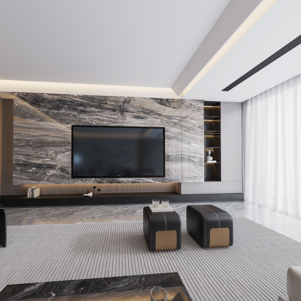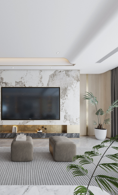開放式的布局,使得空間通透而明亮,墻面與頂面造型簡潔大氣,電視背景墻則用整版大理石來提升空間質(zhì)感。