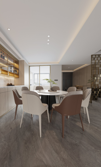 深色大理石地磚和咖色木飾面的搭配為原有空間注入理性色彩,每種材質(zhì)的獨特性無一不在訴說空間的沉穩(wěn)力量。