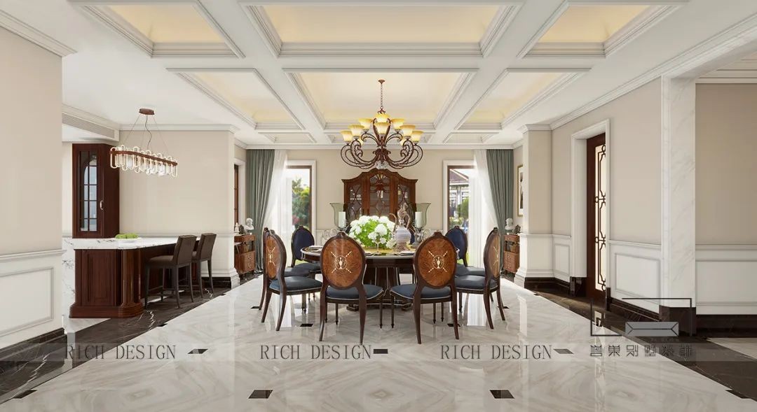 餐廳無論是復古的水晶燈還是棕色的桌椅都讓整體看起來靈動大氣,墻面與頂面造型簡潔流暢,采用不規(guī)則紋理的淺米黃大理石地面,讓空間更加輕盈而不顯沉重。
