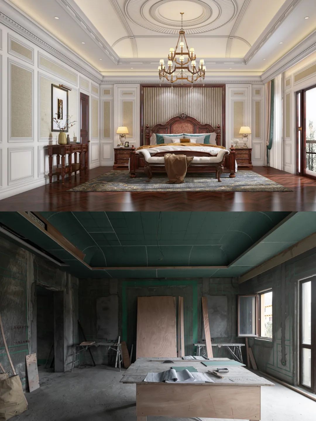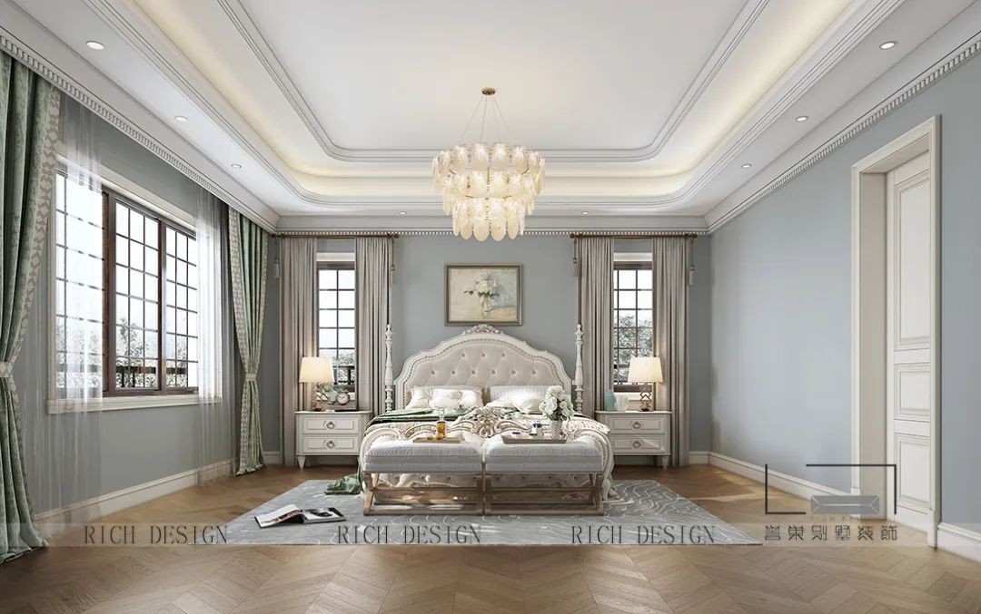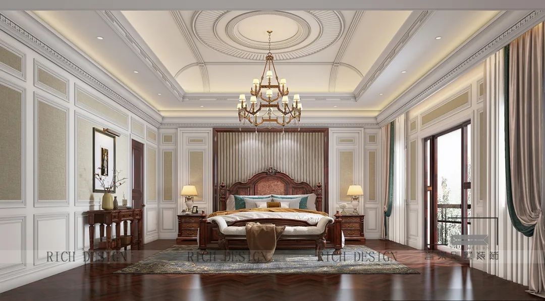 三樓主臥套房簡潔輕奢的天花板與水晶燈,沉穩(wěn)中不失大氣,棕色家具、地板和門窗等自然相呼應,無不彰顯主人不俗的品味和雅興!