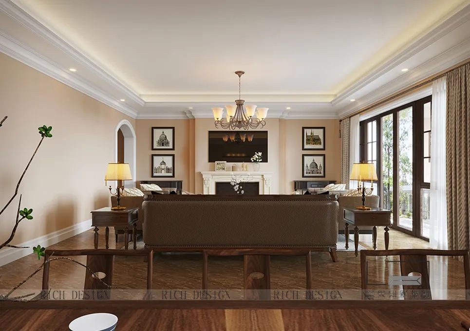 美式風格的客廳,全景大飄窗,通風采光極佳,使得空間感有了很大提升。