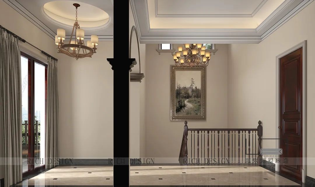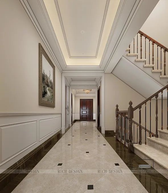 本案過道墻面裝飾大面積留白,以淺色作為空間色彩基調,表現形式上更加豁達流暢,而米白色大理石搭配淺木框的油畫,簡單純粹又不失格調!