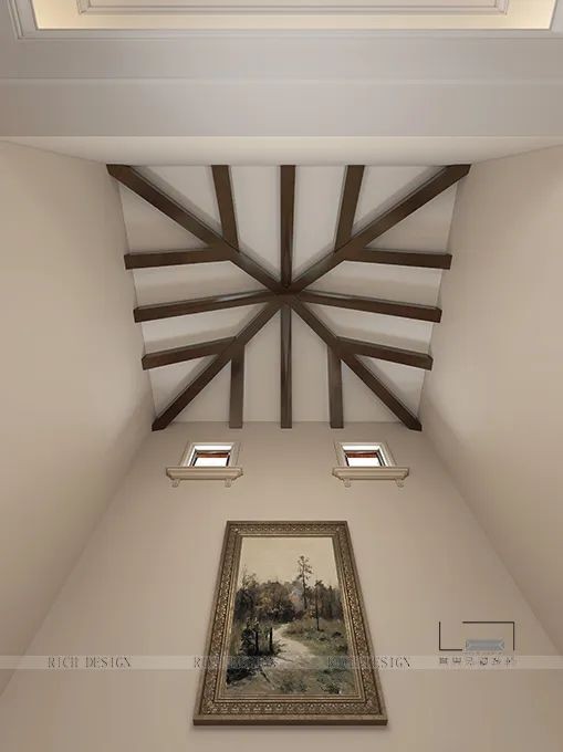 對于房頂空間的利用,設計團隊將其打造成了與自然融合的雪花狀房梁,賦予空間更多的趣味性和層次感!
