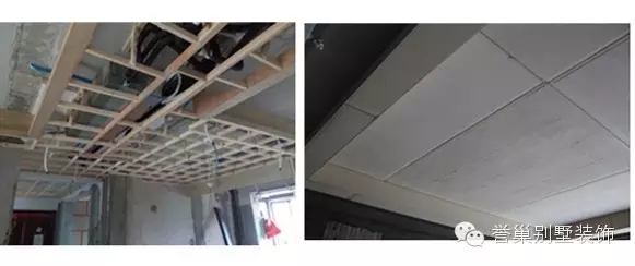 傳統(tǒng)做法:夾板木龍骨天花、或石膏板木龍骨天花,易受潮膨脹,變形開裂,乳膠漆易脫層、掉灰發(fā)黃變色,阻燃性差。